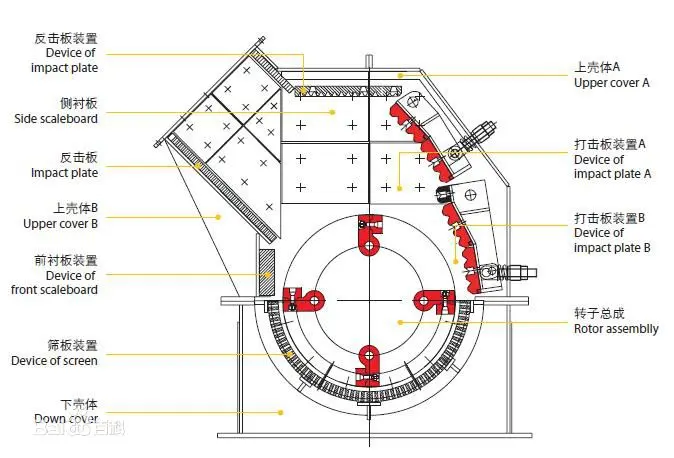 Quruluş sadədir və bir korpus, rotor və təsirli bir boşqabdan ibarətdir. Təsir crusherinin əsas iş hissəsi bir boşqab çəkic ilə yüksək sürətli fırlanan rotordur. Qarşılıqlı təsir prosesi zamanı maddi bloklar bir-biri ilə də toqquşub. Material plitələr çəkicinin vurulduğu kimi, təsir plakasının təsiri və bir-birləri, çatlaq və gevşetin arasındakı toqquşma daim yaranır, bu da nəticədə sarsıdıcı səbəb olur. Zərbə cihazı boşqab çəkicinin vurduğu materiala tab gətirmək üçün istifadə olunur və onu yenidən qurur. Əsas komponent polad plitələrlə qaynaqlanan təsir plitəsidir. Təsir səthində taxıla davamlı astarlar var və bəzi təsirlər və ya xırdalanma plitələrindən istifadə edir.